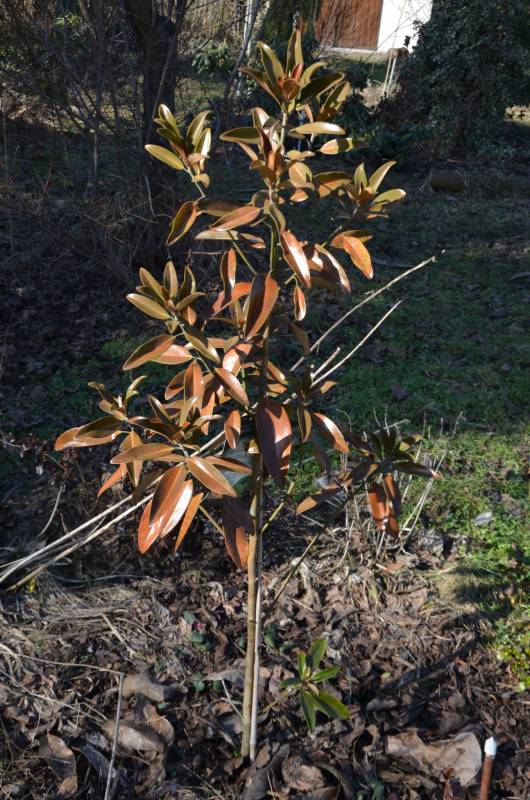 Liście: zimozielone, duże, skórzaste, błyszczące.