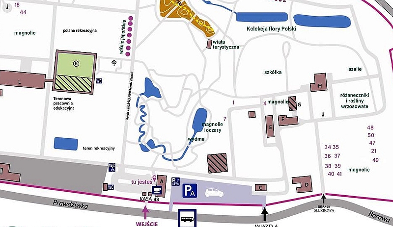 Tu wskazówka, jak dojść (skręt w prawo od wejścia głównego) do wcześnie kwitnących magnolii japońskich i wierzbolistnej, ale także magnolii gwiazdzistych, których na mapce nie zaznaczono a są dokładnie na przeciwko japońskich (!) a za nimi również nie zaznaczone poletko magnolii Soulange'a (!)... potem trzeba trochę pokluczyć wokół budynków, aby dojść do kolekcji dziewczynek... i jeszcze dalej - od razu dodam, że dla mnie to novum i albo dobrze ukryte, albo to nowe nasadzenia, bo nigdy w to miejsce nie dotarłam i nie widziałam - :blink: do magnolii kwitnących na żółto - zaś 'Elizabeth' rośnie w innm miejscu