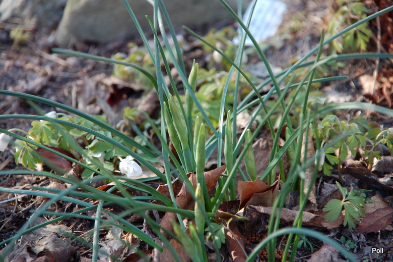 W Jedrzejówce, na słonecznych i osłonietych miejscach narcyzy dostały przyspieszenia - nie tylko widać szczypiorki liści, ale także zawiązane pąki.