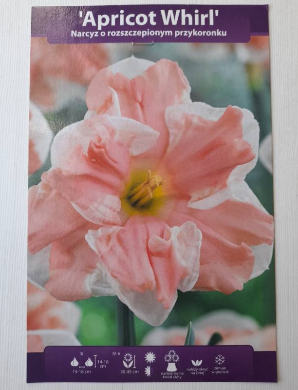 Narcyz ‘Apricot Whirl’ to wyjątkowa odmiana narcyza z grupy split-corona (rozszczepiona korona, zwana też motylkową), charakteryzująca się dużymi, efektownymi kwiatami i delikatną kolorystyką. Jest idealnym wyborem dla miłośników nietypowych narcyzów, które wyróżniają się w ogrodzie lub w bukietach.
