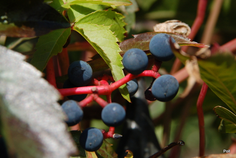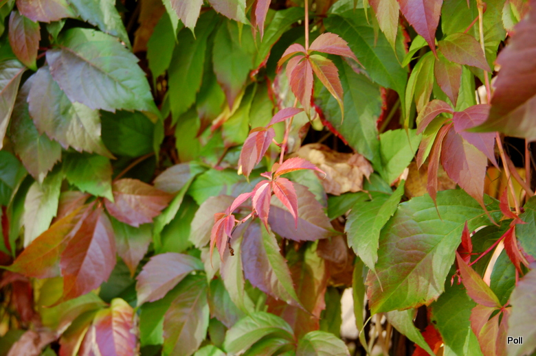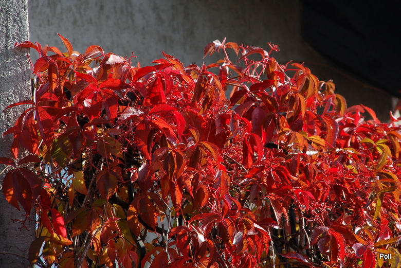 jeden z najbardziej znanych widoków jesiennych - przebarwiony winobluszcz pięciolistkowy (Parthenocissus quinquefolia)