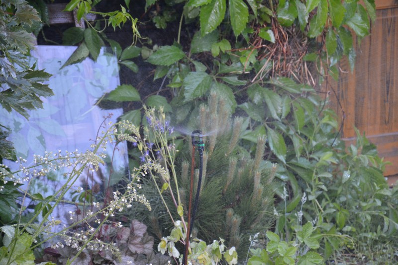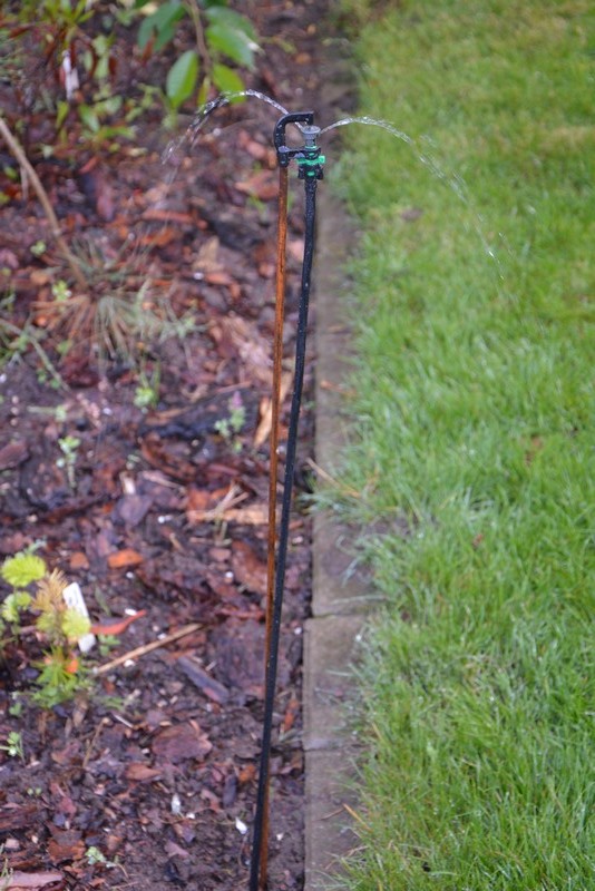Na mniejszych obszarach (przy płocie, przy tarasie) daję mniejszy wirnik (E) lub wkładkę 180 stopni (D). Na stronie dystrybutora można znaleźć opisy każdej z tych wkładek (wirników) wraz z kształtem rozprysku wody, jaki umożliwiają. Zasięg można także w jakimś stopniu regulować wysokością umieszczenia spryskiwacza, ale to mocno zależy od tego, czy w danym miejscu jest wietrznie, czy możemy podlewać rośliny z góry itp. Można dokupić gotowe podstawy do montowania takiego zraszacza, ale ja korzystam ze zwykłego pręta zbrojeniowego fi 5mm, który wbijam w ziemię na wymaganą wysokość. Można go kupić w każdym składzie budowlanym