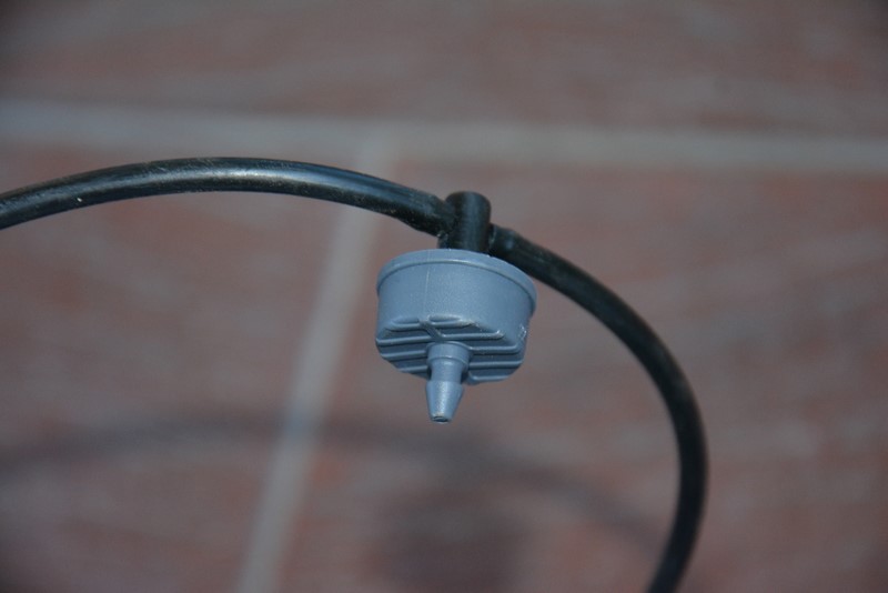 Ilość wody, jaką chcemy dostarczyć roślinie określamy poprzez dobór głowicy (dostępne są 2, 4 i 8l/h). Jak widać w pokazanym przypadku do głowicy podłączone są dwa kroplowniki (podlewanie z dwóch stron lub dwóch roślin), ale można podłączyć też jeden lub cztery w zależności od potrzeb. Można go oczywiście złożyć samemu dobierając choćby różną długość wężyków. Montuje się je podobnie jak mikrozraszacze. Prościzna