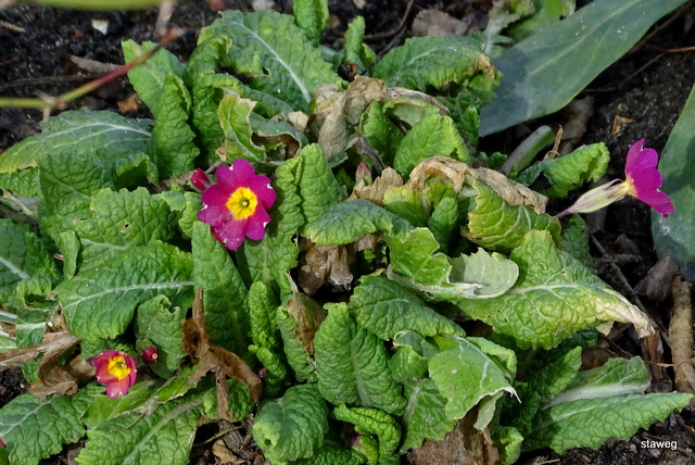 Niepokoiłem się o Pierwiosnki bezłodygowe, które nie zimują w naszych warunkach, a które wysadziłem już, żeby było barwniej. Okazało się jednak, że dają radę. Kwitną też niektóre zimujące na rabatkach.