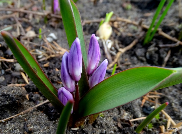 Kilka słonecznych dni sprawiło, że rabatki się mocno zabarwiły. Mocno ujawniają się - na razie liśćmi - tulipany, hiacynty, szachownice, śnieżniki, czosnki, zimowity itd.