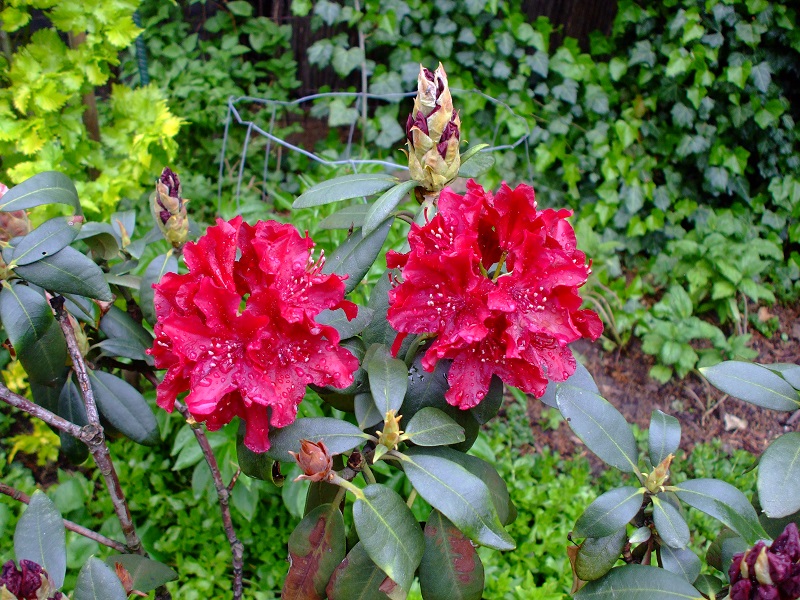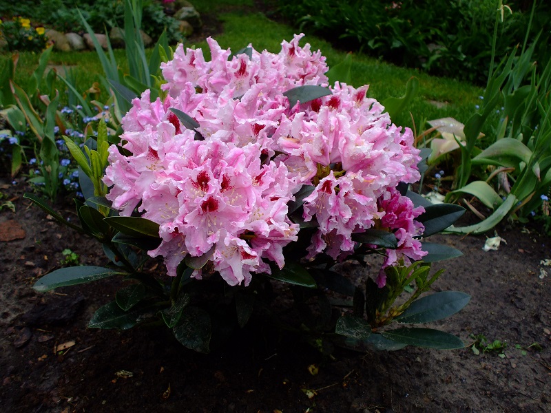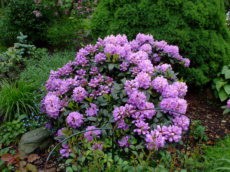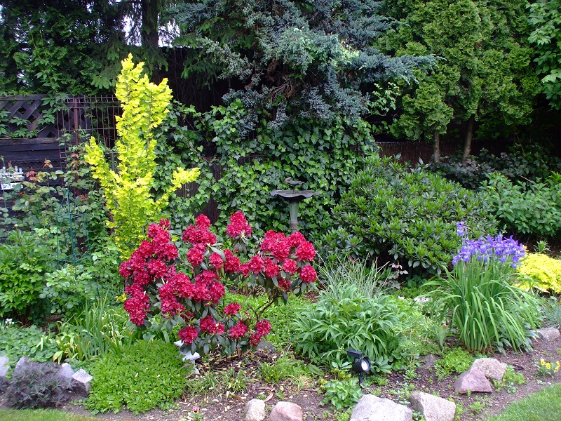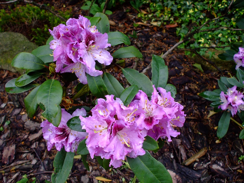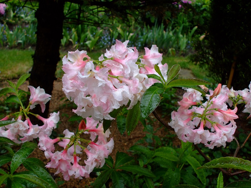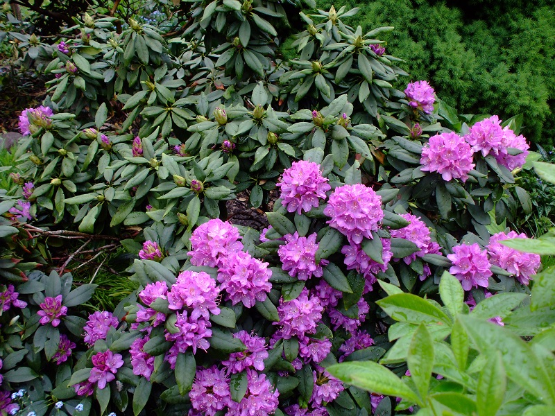 rododendrony zaczynają zakwitać, niektóre pojedynczymi kwiatami. Te dwa, co roku tak dziwnie zakwitają połową krzaczka, tą od słonecznej strony. Później zakwita druga strona.