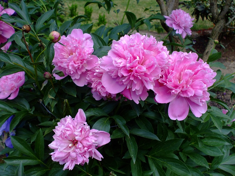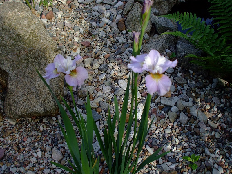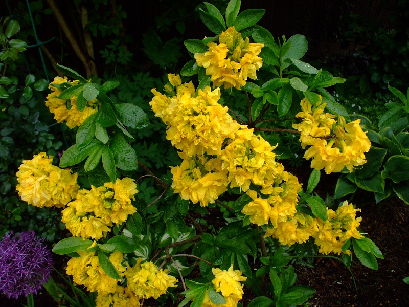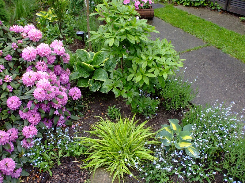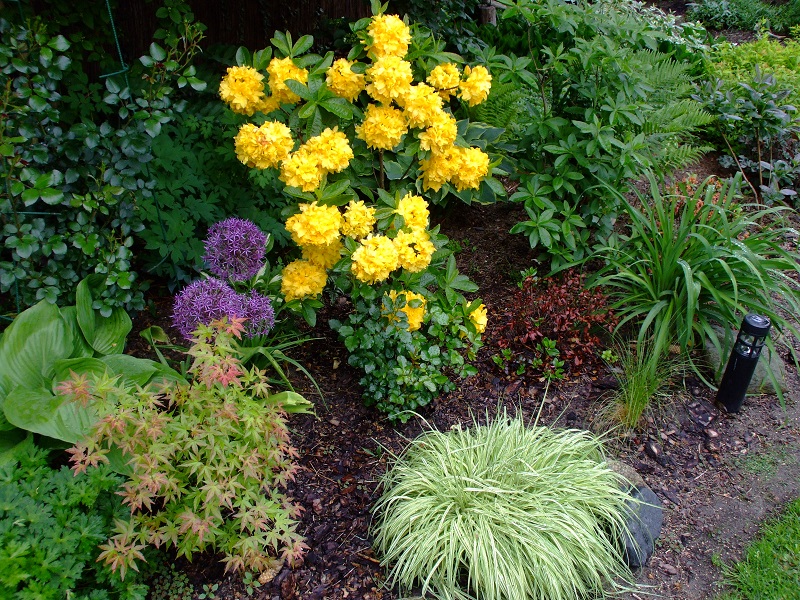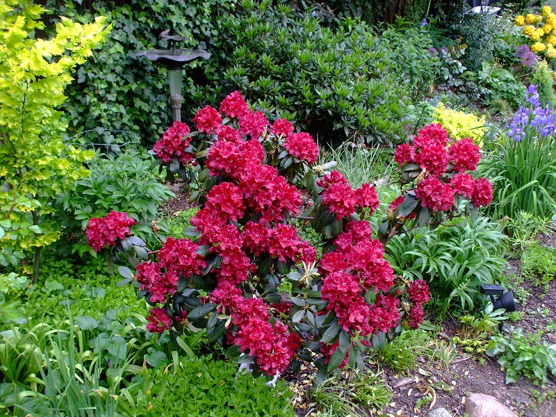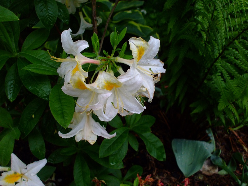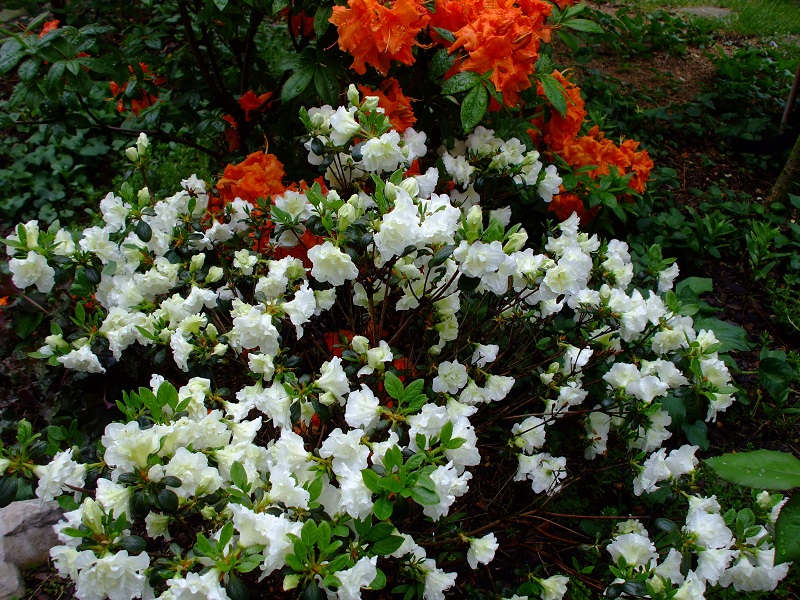 rododendrony zaczynają zakwitać, niektóre pojedynczymi kwiatami. Te dwa, co roku tak dziwnie zakwitają połową krzaczka, tą od słonecznej strony. Później zakwita druga strona.