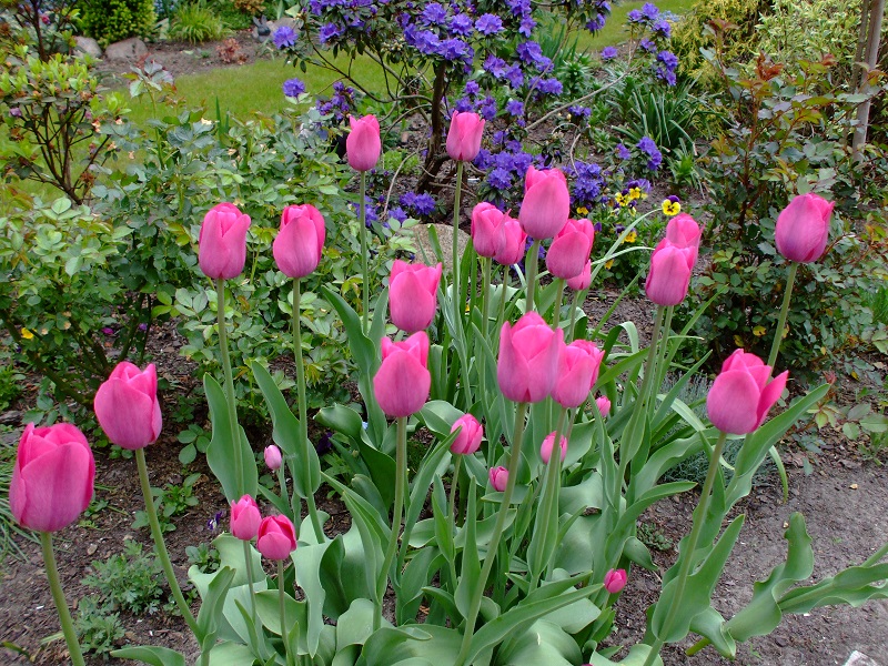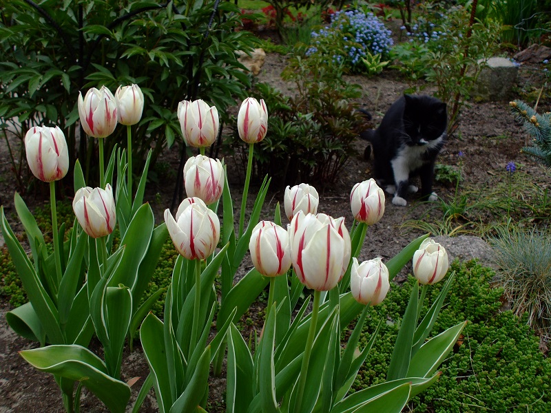 Wszystko u Ciebie ,jak w wojsku ,na baczność stoi :woohoo: Ogródeczek gotowy do pokazania .Mimo suszy rośliny jakoś sobie radzą pędzone siłą wiosny .Sporo masz tulipanów ,a ja ostatnio mało kupuje cebul .Jak nie robale ,to nornice .A te moje dwie leniwe kocice występują w roli obserwatorek :mlotek