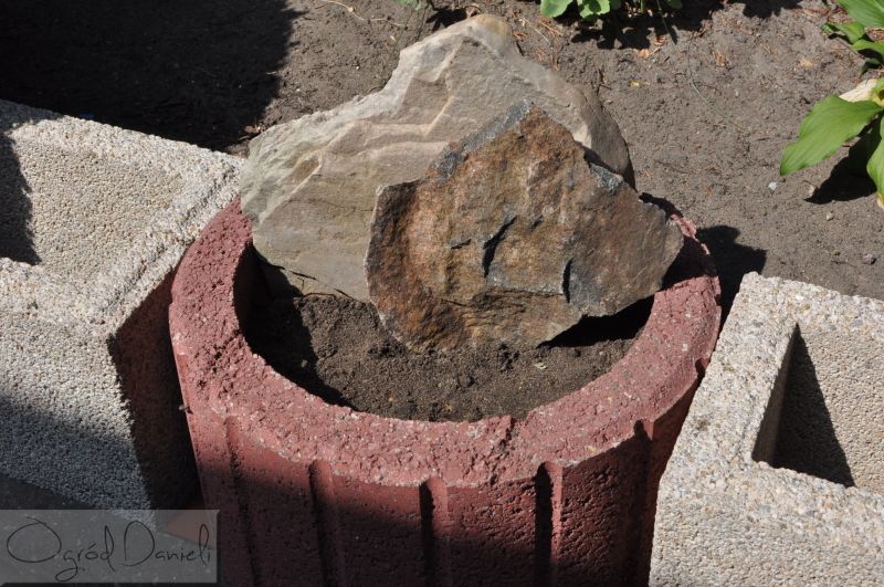 Tadeusz ustawił mi dwa prostokątne gazony, a w środku jeden okrągły o średnicy ok. 35 cm (średni). Gazony takie są dostępne w marketach budowlanych, ten czerwony kosztował niewiele więcej niż 6 zł. Widoczne także kamienie do szczelinowca, keramzyt i drobne kamyki
