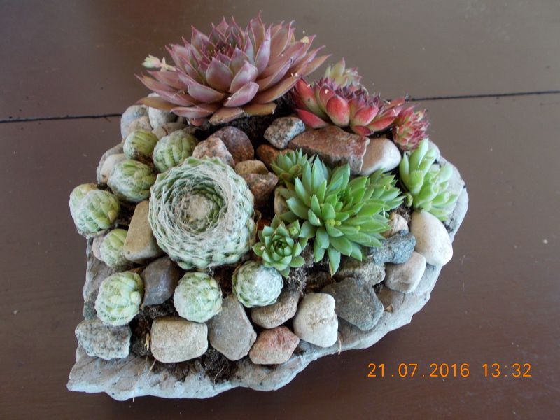 Jeżeli chodzi o rośliny użyte do tego skalniaka to były głównie jakieś znajdy, rośliny skalne znajdowałam na działkach (na swojej), uciekające na drogę z innych ogródków, niektóre rojniki dostałam od działkowców. Jedynym zakupionym był karmnik ościsty. Nie znając do końca ich możliwości rozrostu pewnie popełniłam kilka błędów, ale efekt i tak był dla mnie zadowalający.