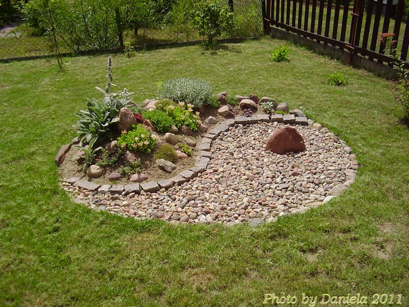 Wycięliśmy z trawnika darń na planie koła o średnicy 2 m. Na obwodzie koła zostały wyłożone podłużne kamienie - z jednej strony wyższe, na połowie obwodu mniejsze. Chodziło o oddzielenie skalniaka od trawnika.