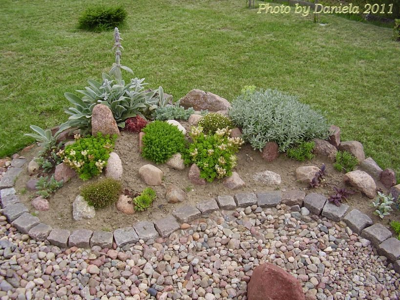 W jednej z "łezek" nasypaliśmy niewielką górkę z ziemi i ułożyliśmy kilka kamieni, a na szczycie największy "w szpic". Z perspektywy czasu zrobiłabym to nieco inaczej, cała tę górkę ułożyłabym z kamieni, a tylko przestrzenie uzupełniła ziemią. Skalniak został po paru latach zlikwidowany, bo regularnie był niszczony przez kreta. Z tego powodu nie polecam samej ziemi do usypania górki.
