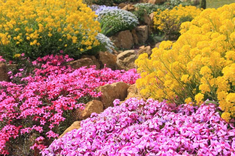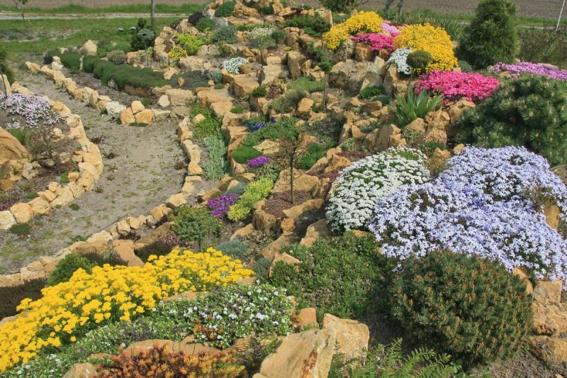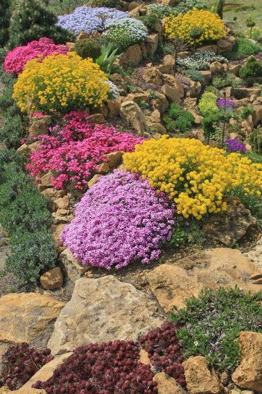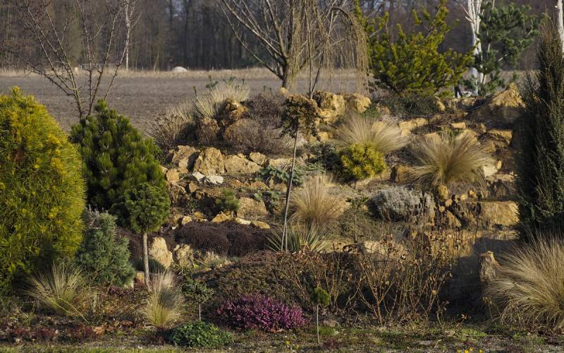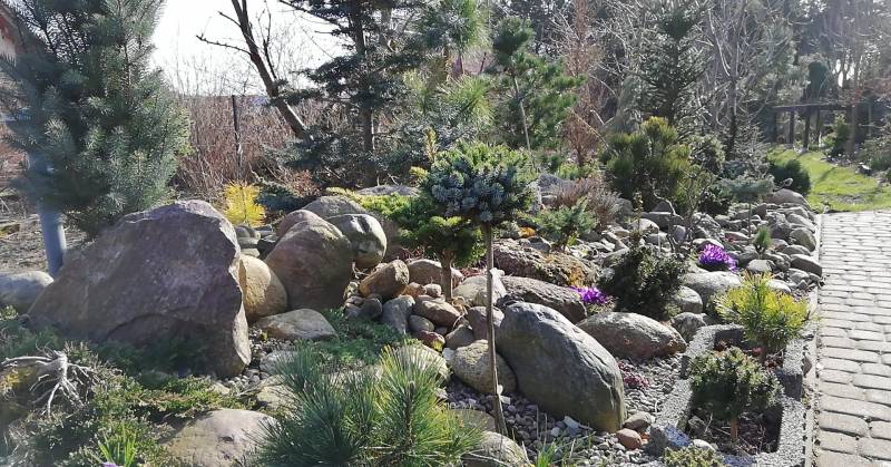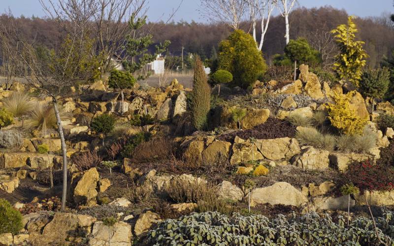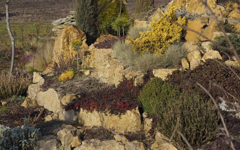 Beato kolorowe głazy fajnie kontrastują z roślinami i nie zlewają się z podłożem. Przez to ogród skalny zyskuje na wyrazistości.