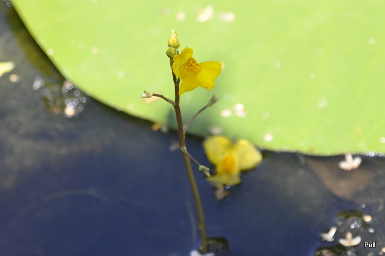 Kwitnie właśnie pływacz zwyczajny (Utricularia vulgaris), roślina występująca także na stanowiskach naturalnych w Polsce - w rowach, płytkich stawach, jeziorach, rozlewiskach rzecznych.Jest dość niepozorną rośliną pływającą, która nie korzeni się w podłożu. Umożliwiają jej to pęcherzyki wypełnione gazem, pełniące zarazem funkcję...pułapek na drobne zwierzęta wodne. Gdy dotkną one pęcherzyka, automatycznie otwiera się klapka, która wraz z wodą wciąga do wnętrza ofiarę. Za ich rozłożenie do stopnia umożliwiającego strawienie jej, odpowiedzialne są enzymy.