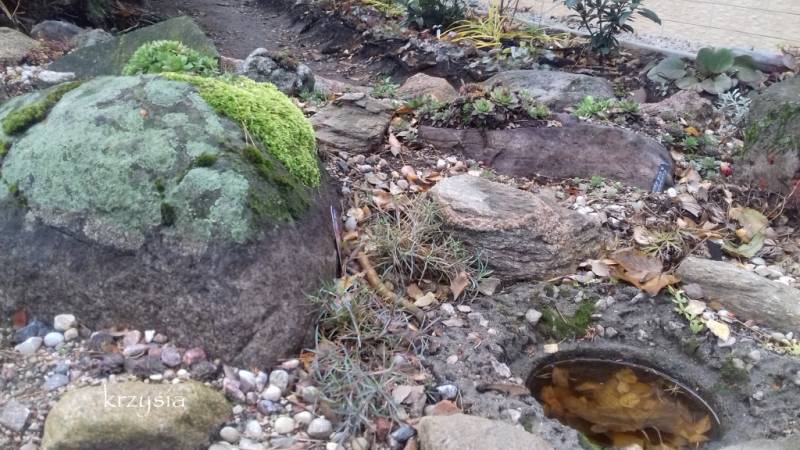 bo najpierw wymienialiśmy całą elektrykę i nie było prądu, a potem ciągle brakowało czasu, żeby wyczyścić. No ale w końcu wczoraj się za to zabrałam. Odwaliłam kamienie, wywaliłam z niecki dwa wory igliwia i innego śmiecia, wyczyściłam na ile się dało. Niestety okazało się, że pompa jest zepsuta (czemu się trudno dziwić - od kilku lat zalegała na dnie), no i w związku ze związkiem z ciurkadełka powstała dziurka wodna. Pewnie będzie to rozwiązanie tymczasowe (bo igliwie leci tam na potęgę), ale z drugiej strony jak się sprawdzi, to kto wie... Podobno nie ma bardziej trwalszych rozwiązań niż prowizorki...