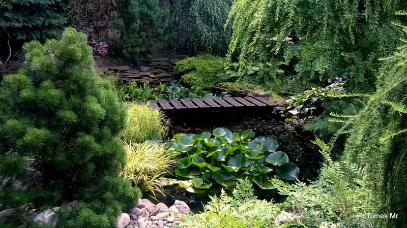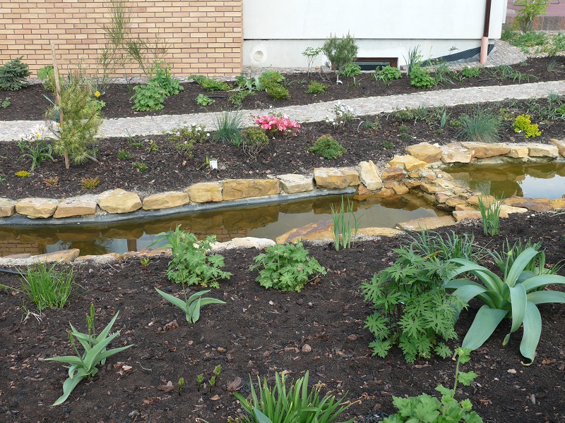 Tu brzegi oczka zostały wyłożone płaskimi blokami piaskowca.