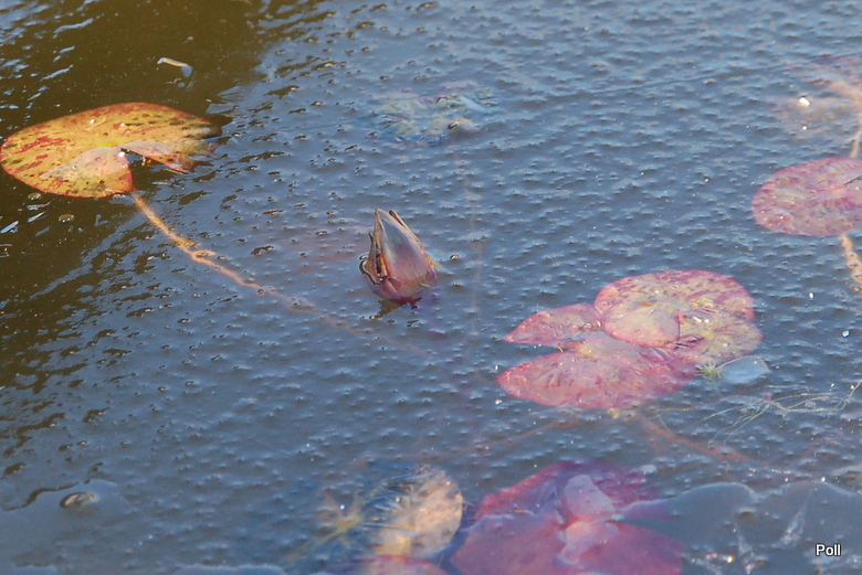 Od roku mam w oczku problem z liliami wodnym (foto). Mam od kilku lat błotniarkę, która bardzo mi się rozmnożyła. Glonów nie mam, ale woda jest przeźroczysta ciemna. Jaka jest przyczyna?, Co zrobić?