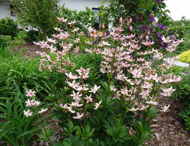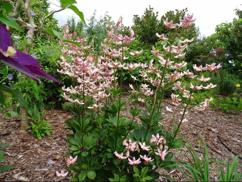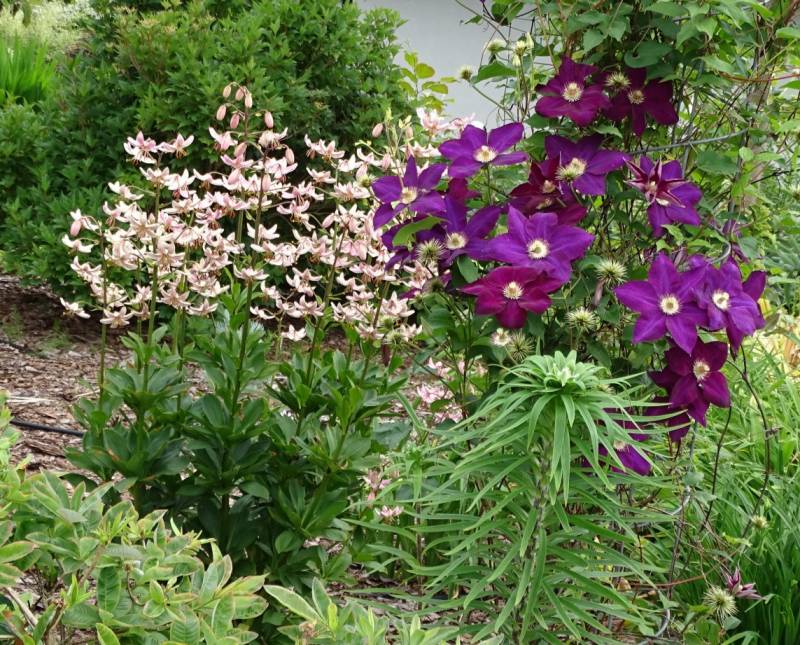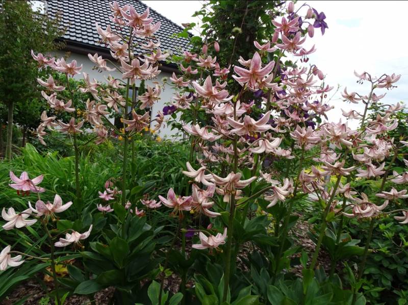 Piękny maj w ogrodzie i zaskakujący urodą wczesny powojnik, :kocham u mnie w tym czasie panuje bladoróżowy powojnik górski.