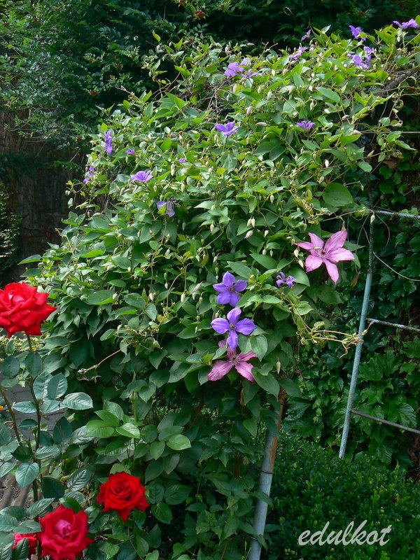 róża Burgund 81 i powojniki wielkokwiatowe Barbara i Semu