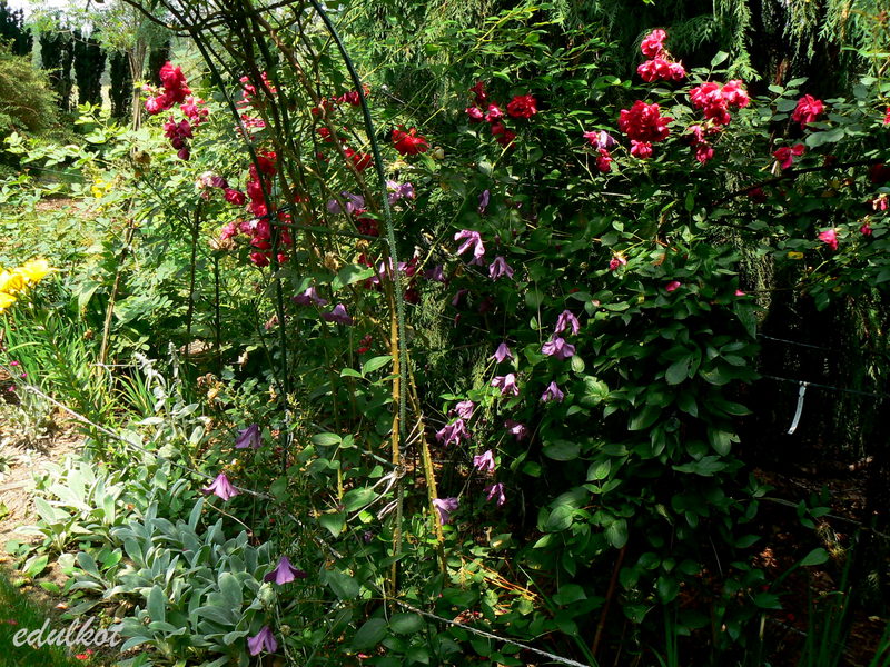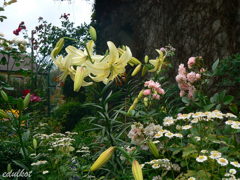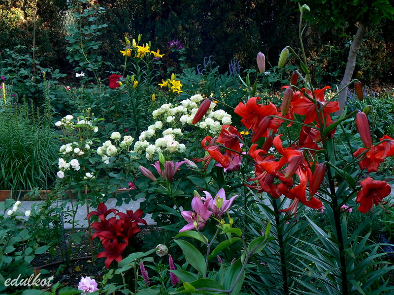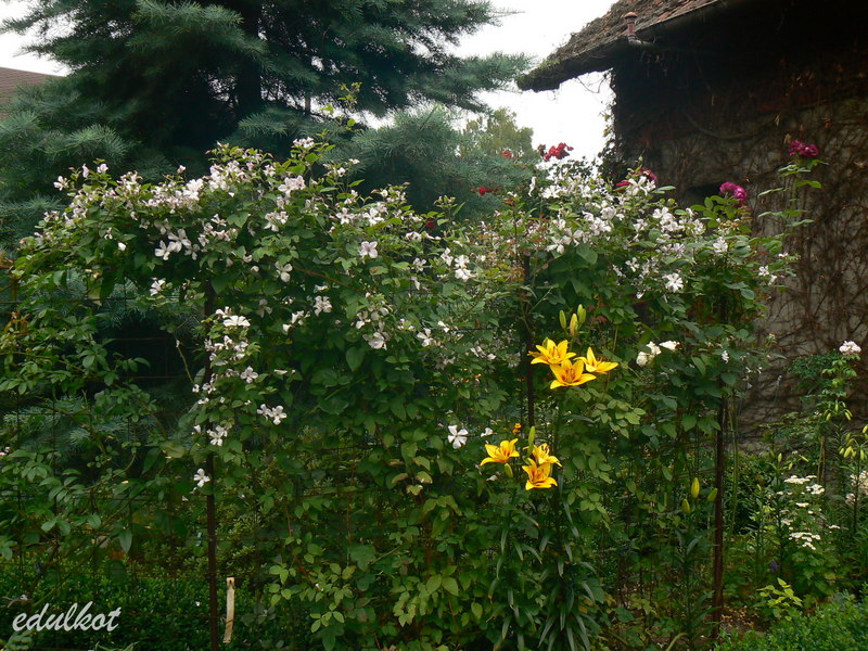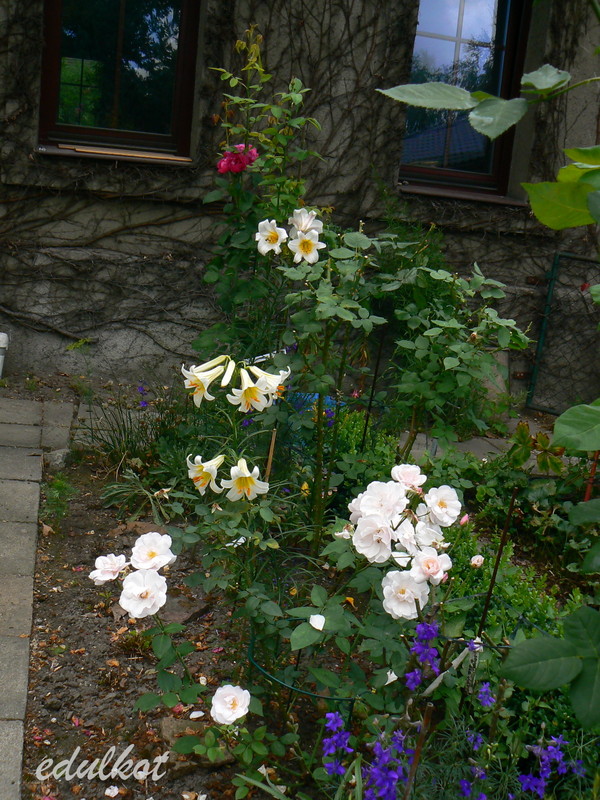 uwolniona z przygniatających ją wielkich różyc kwitnie Souvenir de St. Anne's a towarzyszą jej lilie trąbkowe Regale Alba i Cosa Rosa, na końcu dość wysoko pierwsze kwiatki powtórkowe Souvenir de Jeanne Balandreau