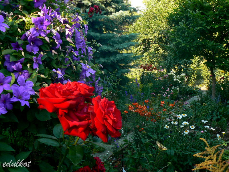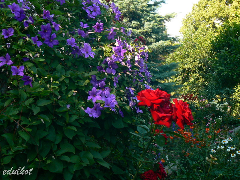 kwintesencja czerwcowych rabat: powojniki, róże, parzydło leśne, złocień właściwy, lilie, jeżówki, ostróżki jednoroczne, koper ogrodowy i dużo zieloności