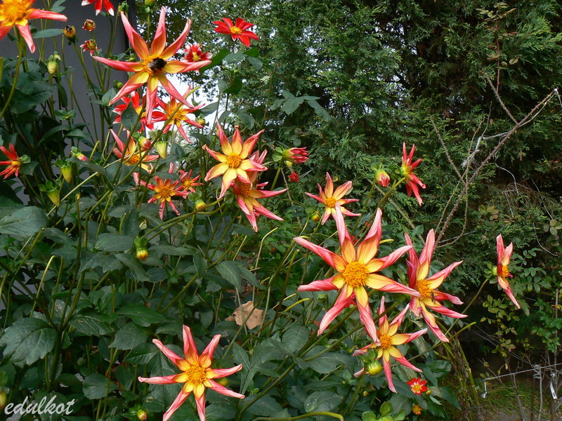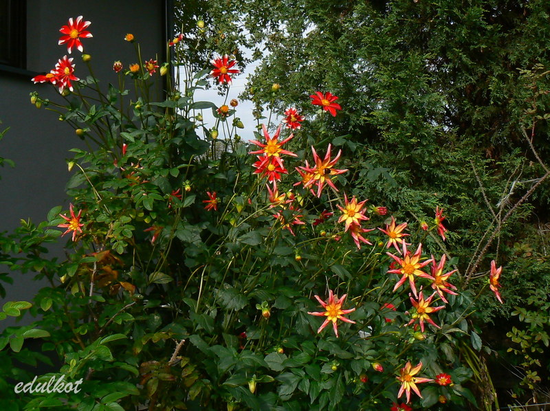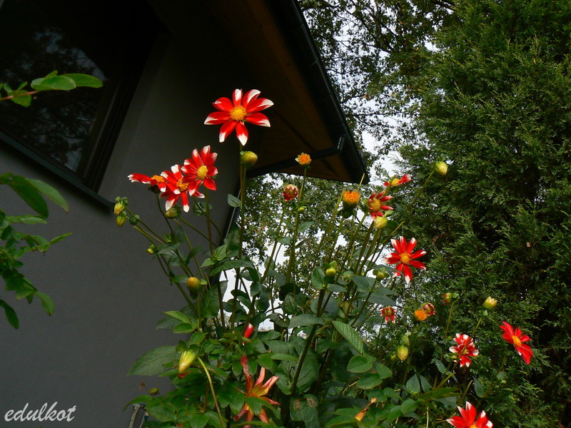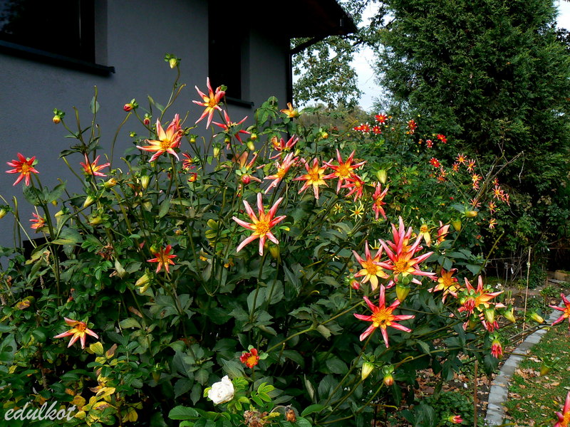 Nelu dalie zaczęły kwitnąć pod koniec czerwca i nieprzerwanie kwitną do teraz, choć były delikatne przymrozki, ale bliskość domku i wielkich dębów i iglaków osłoniła je przed chłodem.
