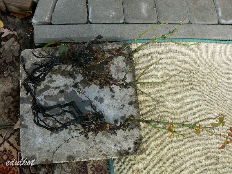 Dzisiaj zabrałam się za wykopywanie różanych zdechlaków z przypłotowej, Jedna to Essentiale Cover, jedna z niewielu jakie kupiłam w doniczce. Rosła parę lat marniejąc z roku na rok. Po wykopaniu okazało się, że w tej doniczce były dwie sadzonki.