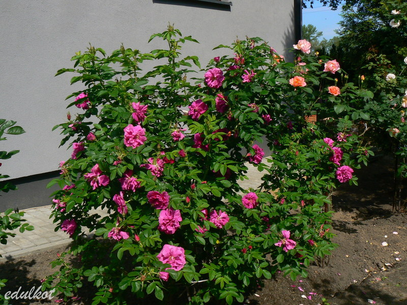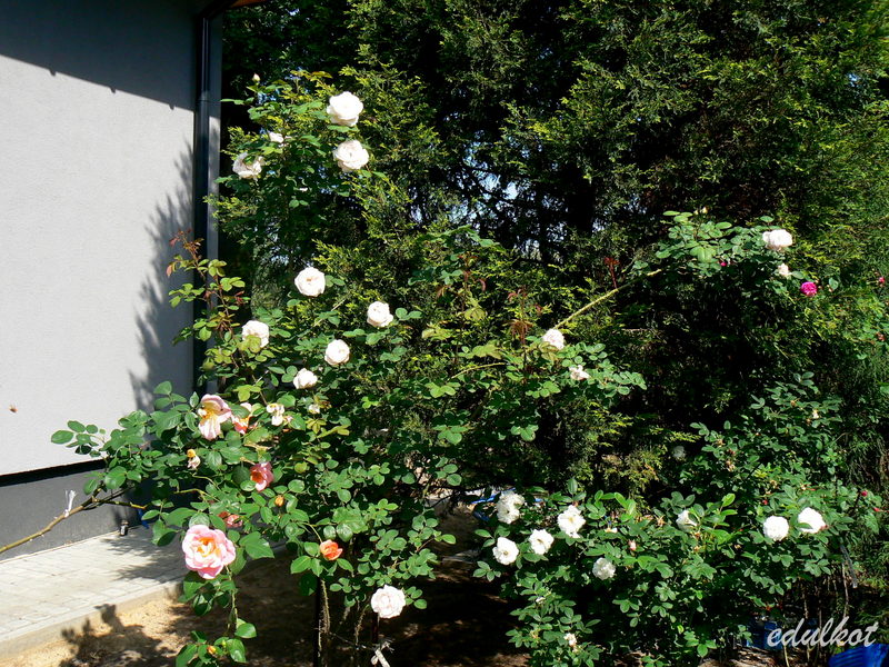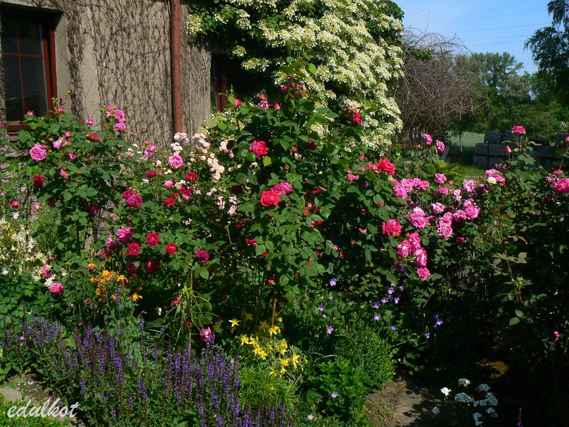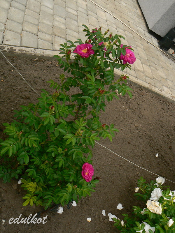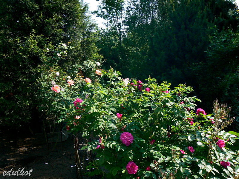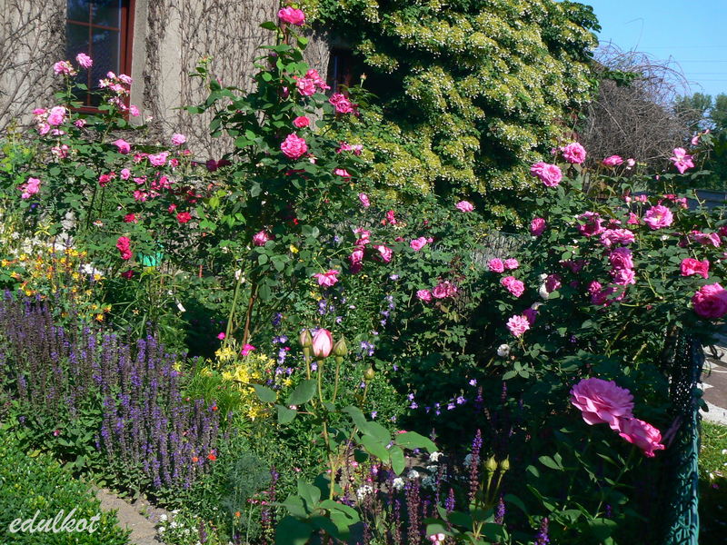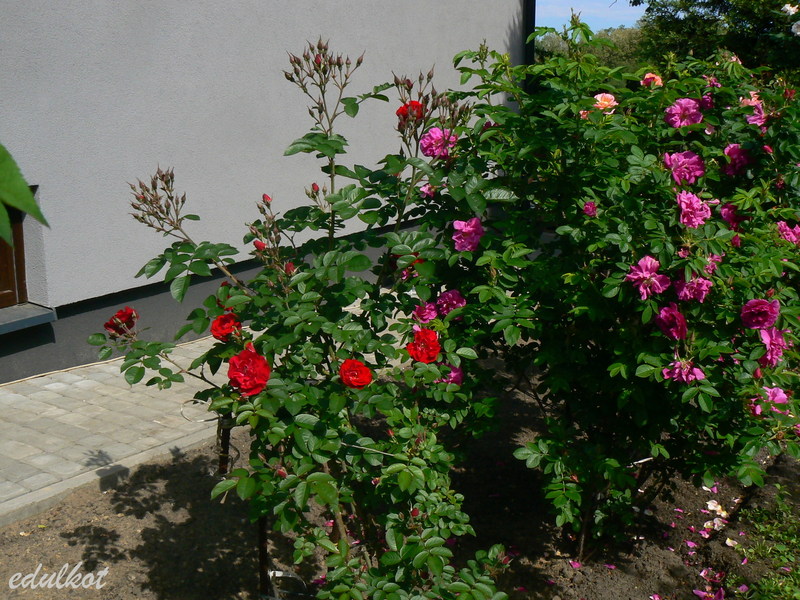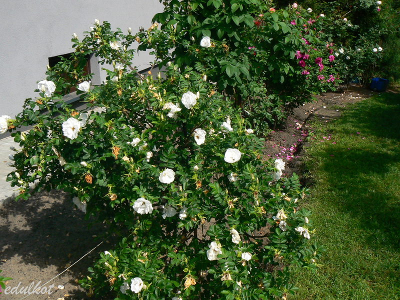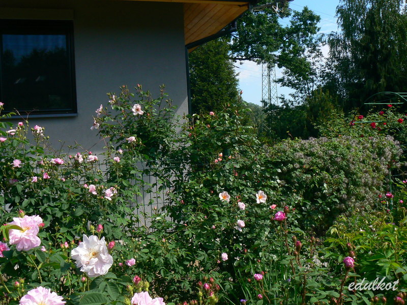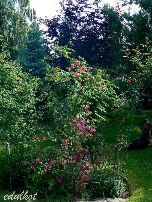Dzisiaj wschodnia rabata przy domku z rugosami, rosną tam patrząc od łuku: Leopold Ritter, Rotes Meer, Blanc Double de Coubert, Ruskin, Linda Campbell, Hansa, Dr. Eckener, Souvenir de Christophe Cochet, Louise Bugnet i przy cyprysiku Himmelsauge.