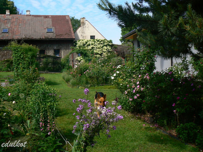 Basenowa jest już obsadzona po obwodzie, oczywiście różami, od zachody rosną dwie piwonie, a od wschodu zagnieździł mi się chrzan wsadzony tam tymczasowo, ale został na wieki, a na samym środku rośnie stara, wielka ale coś ostatnio bardzo chorowita Dr. W. Van Fleet :kocham