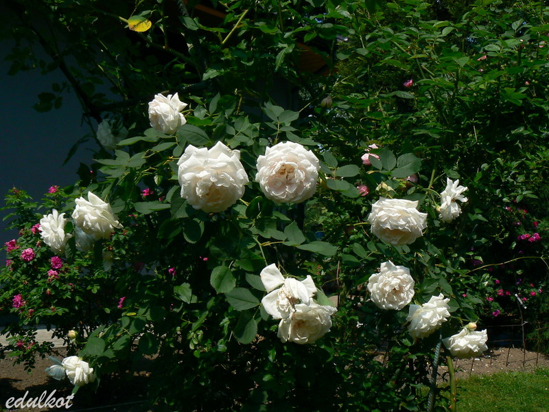 Iceberg Cl.na łuku, a obok rosnące na cyprysika Blaze, Eurydice i Rosarium Uetersen