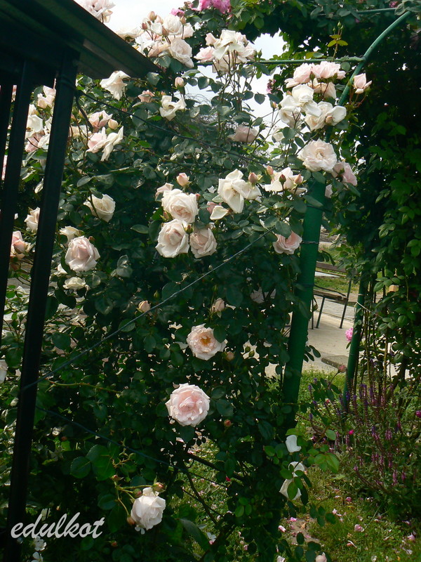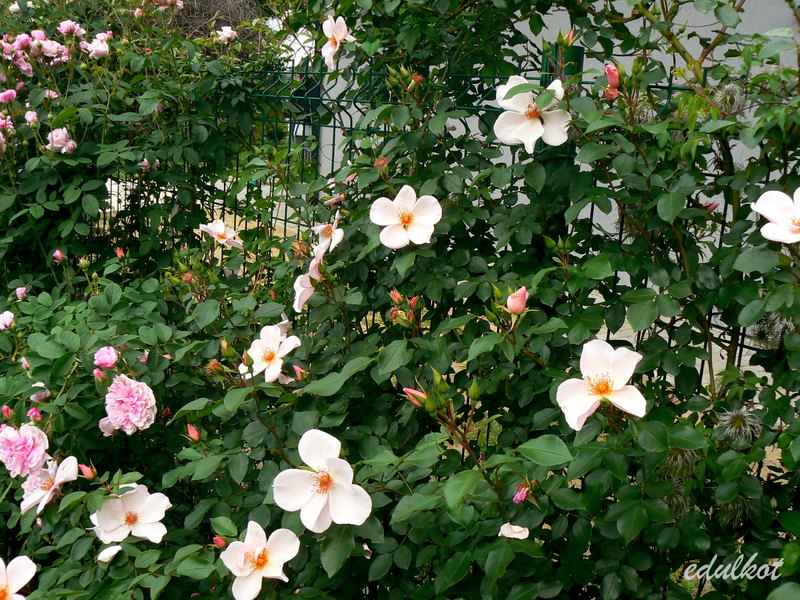 Majeczko May Queen ma dość cienkie pędy więc łatwo się ją oplata wokół podpory dlatego kwitnie już na tych najniżej oplecionych pędach. Mam je takie długie, że jak wczoraj sprzątałam na tej rabacie to jej pędy przypięłam na sąsiednim łuku 2smiech