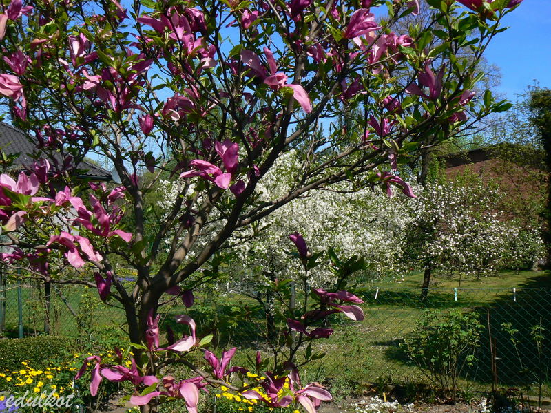 za magnolią w pełni kwitnienia wiśnie, dalej zaczynają jabłonki