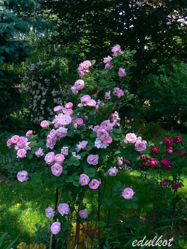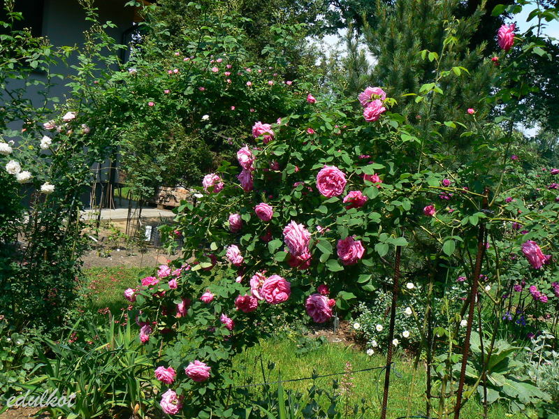 Paul Ricault mieszaniec róż: bourbon i centifolia, kupiona na cześć najmłodszego syna, długo się zbierała, w końcu się rozrosła i najobficiej kwitnie na przygiętych długaśnych pędach