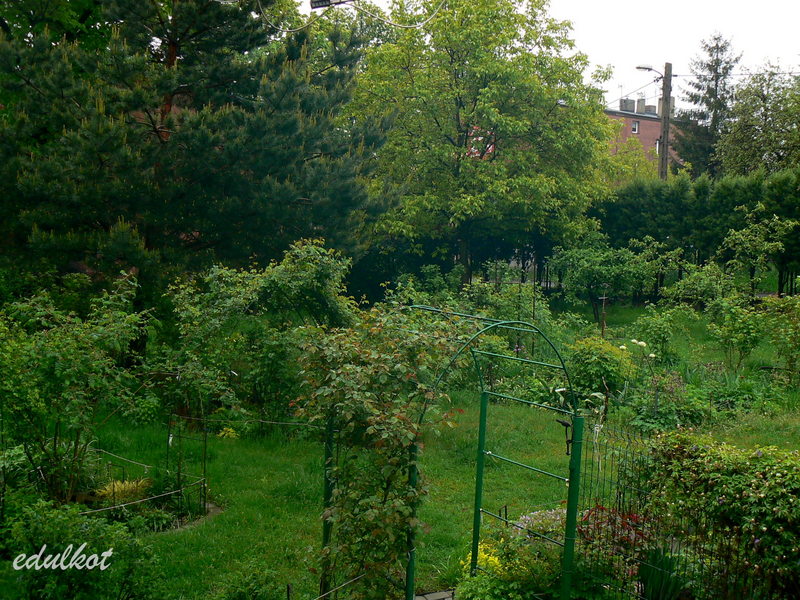 wychylając się i patrząc za wschód widzimy sosnę, basenową, łuki z różami i wielgaśny orzech włoski