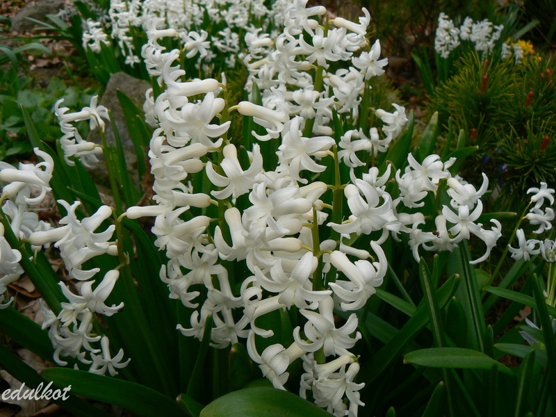 Te białe to jest hiacynt wielopędowy "White Festival" żyjący w naszej rodzinie od niepamiętnych czasów. On jest dużo wcześniejszy niż te grubasy orientalne i każdego roku wdzięcznie kwitnący, pod warunkiem że wywrotowe podziemie go nie wyżre, co się zdarzyło jednej zimy.