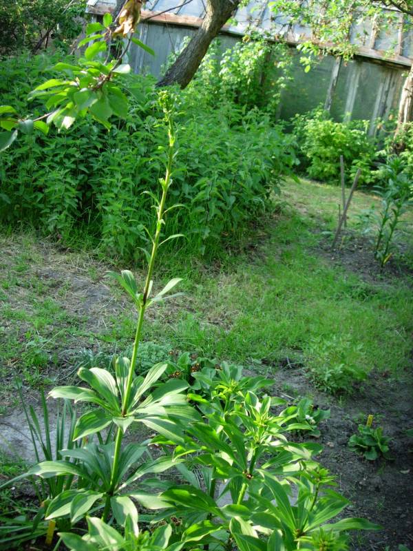 Połączę przyjemne z pożytecznym i pokażę swojego najbardziej zaawansowanego martagona (pęd kwiatowy już wyprostowany) na tle pokrzywowego poletka.