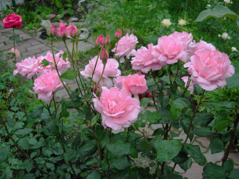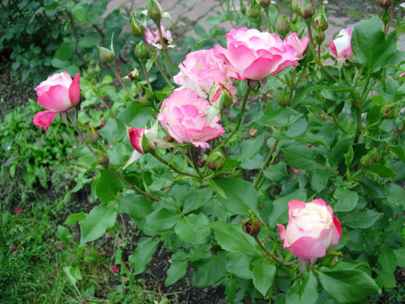 róża. Zawsze ma tak wiele, ak wielkich kwiatów, że krzaka prawie spod nich nie widać. Aquarell ściga się z nią jak może. U mnie dopiero rozkwita Tourbillon i My Girl. Inne róże zaczynają już mieć świeże odrosty, więc nawożenie zdecydowanie im się należy.