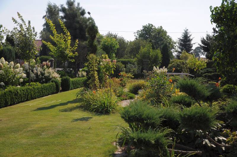 z tyłu domu dalszy ciąg ogrodu, w tym żywopłocik z trzmieliny, cięty w trapez, genialne