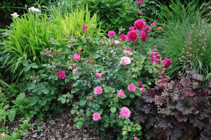 , głównie krzaczki lub same kwiatki, czasem w towarzystwie bylin. Prawda jest taka, że jak mam jakies zastrzeżenie do jakiegoś połączenia, to omijam aparatem, ewentualnie pokazuję tylko szczegóły. Ta tendencja świadczy o tym, ze jednak kompozycja jest dla mnie najważniejsza i jeśli są w niej braki, nieścisłości, czy niekonsekwencja, to jej nie pokazuję. Do tego nie wszystkie kompozycje wyglądają tak, jak w moich wyobrażeniach, a często przypadkowe zestawienia są tak trafione, jak sama nigdy bym na to nie wpadła. Dlatego znalazłam jeszcze trzy obrazki (tylko trzy), ale zawsze mogę zasypać Was zdjęciami pojedynczych róż