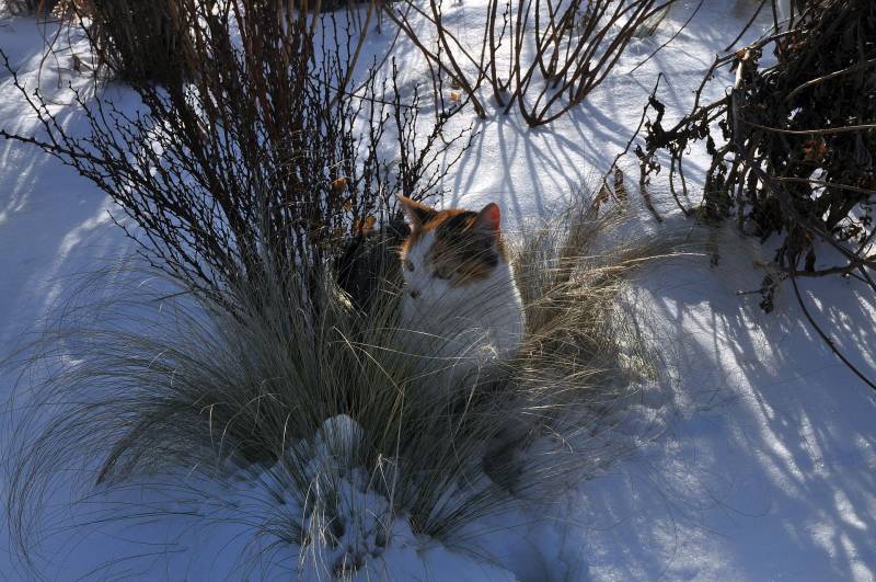 Niby trochę śniegu jest, ale czy wystarczająco think: ? Pokrywa od kilku do kilkunastu cm, tam, gdzie nawiało. Nie za dużo, ale tłumaczę sobie, że lepiej cokolwiek niż wcale :dry: . Ptaki wyjadają wszystko w takim tempie, że nie nadążam dosypywać :ohmy: , koty na szczęście siedzą w domu, wychodzą tylko na szybką toaletę ;)