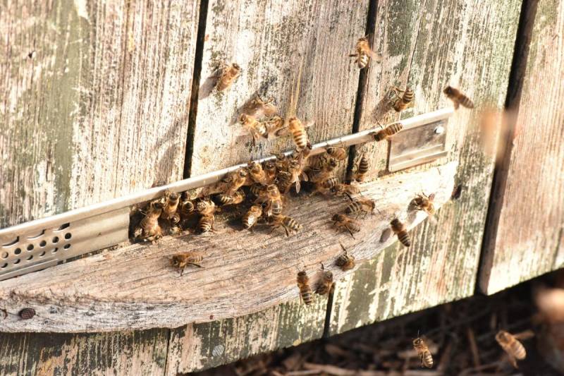Platforma wentylacyjna: W upalne dni pszczoły wychodzą na wylotek i wachlowaniem skrzydeł wytwarzają ruch powietrza, chłodząc w ten sposób wnętrze ula.