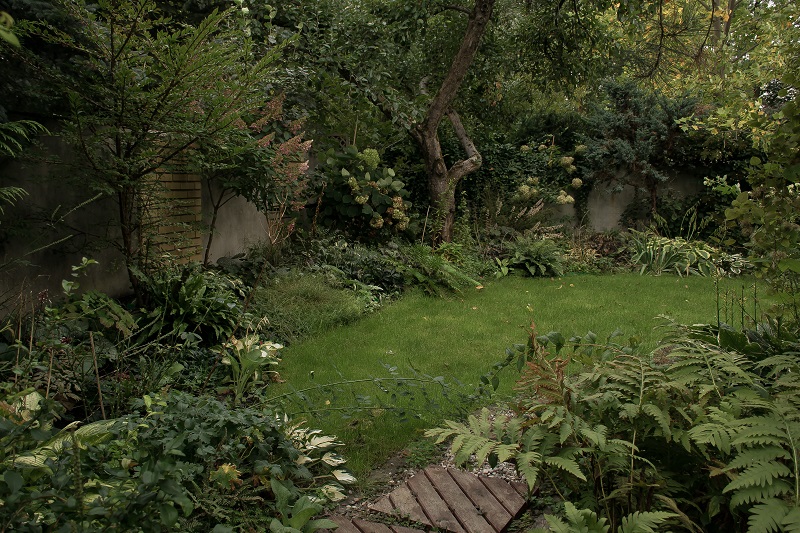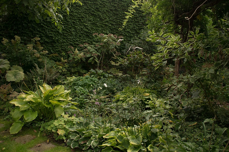 W ogrodzie mokro i mroczno. Na rabatach kontrastowo wybarwione na żółto hosty.