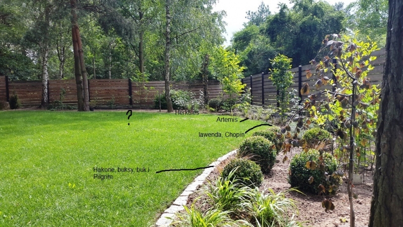 Na tym fragmencie ogrodu, który teraz pokazujesz na zdjęciu (skądinąd piękny!), widzę wspaniałe łany hortensji z trawami, podsadzone runiankami, dereniami kanadyjskimi, hostami, paprociami, ciemiernikami, serduszkami Alba, zawilcami, kulami cisowymi/bukszpanowymi, dereniami Spaethii...