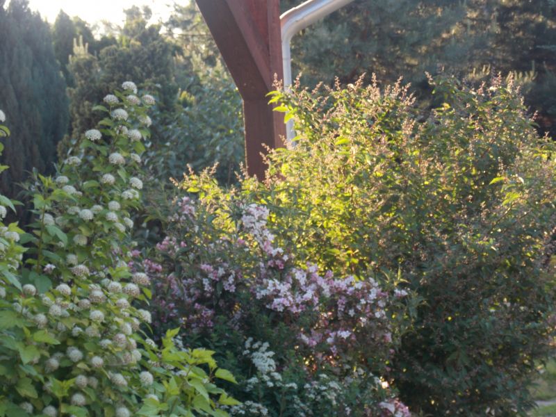 W miejsce maleństw i kwiatuszków posadziłam pierwsze większe krzaczki. Tym sposobem mam lilaka, krzewuszki, pęcherznicę Luteo , szarą tawułę. Dookoła nich porozkładałam pniaki, kamienie i pilnowałam. To było 5 lat temu w pierwszym moim sezonie na wsi. Te rośliny są już dojrzałe, rozrośnięte w miejscu przed samym domem ( oprócz lilaka)