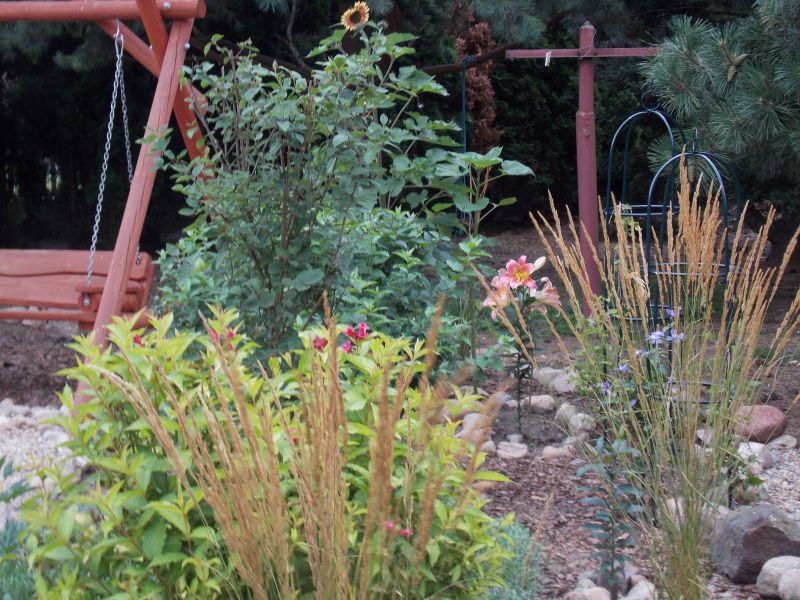 Pieski podrosły i w zeszłym roku eksperyment w znanym Wam miejscu z huśtawką, gdzie lubiły przebywać. A mnie było tam pusto, smętnie i nijak. I kolejne większe rośliny, bez jakiejś koncepcji za to z myślą : jak nie wykopią i przetrzymają to robię ogródeczek. I tak to się zaczęło i zgodnie z planem ten rok jest poświęcony tej pracy ogrodowej. Próba lilii, ostrózek - jak tam pieski je potraktują wypadła pomyślnie. Jedynie róże dalej są przez nie niszczone. Pewnie nie chcą abym kochała bardziej różyczki niż je - to są psy ogrodnika :diabelek