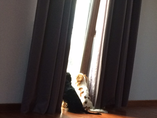 Jakiś hałas je obudził, więc z ujadaniem podleciały do balkonu budząc mnie o tej nieludzkiej godzinie.po czym tak sobie siedziały dłuższy czas- zadymiarze..