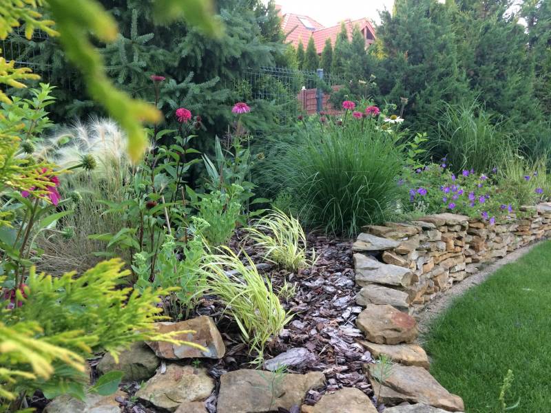 Z drobnych zmian..pojawiła się nowa trawa nad ciurkadełkiem.. Hakonki rosły na widoku i ciągle były podbryzane przez moje dwie kozy.. Przesadziłam je głębiej, żeby tak nie kusiły, a w ich miejsce pojawiła się molinia o dzwięznym imieniu Edit Dudszus