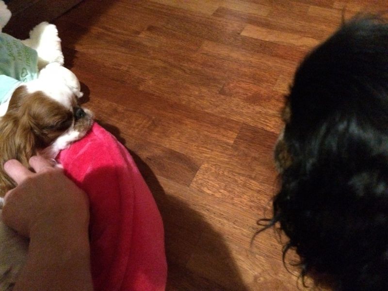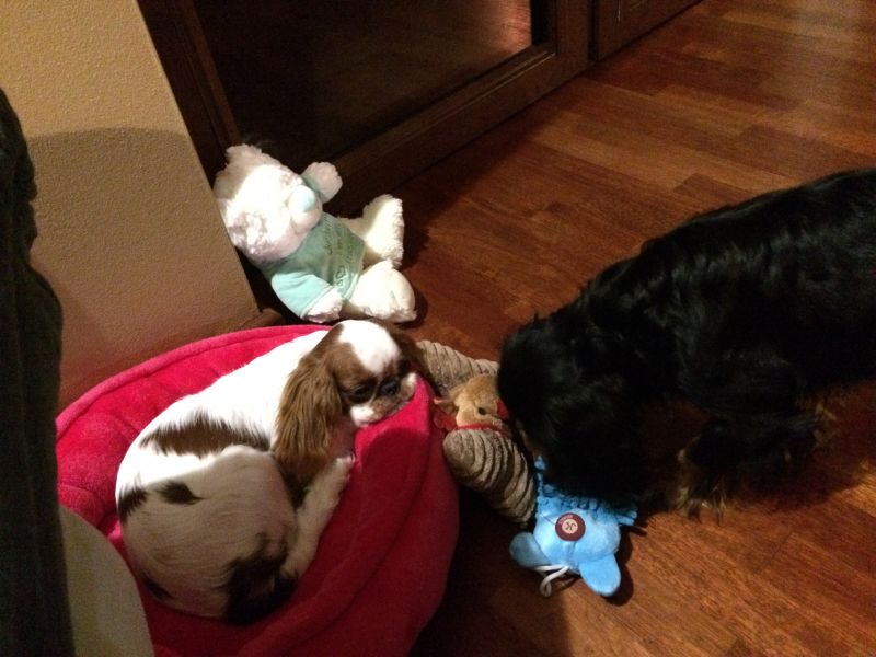 Cyguś jest jednak bardziej samolubnym psiakiem. Wczoraj wieczorem ostro odgonił maluszka, jak otworzyłam cargo, gdzie chowam psie smakołyki- maluch w popłochu uciekł z kuchni.. Huknęłam na Cygusia, a on zrobił skruszoną minę.