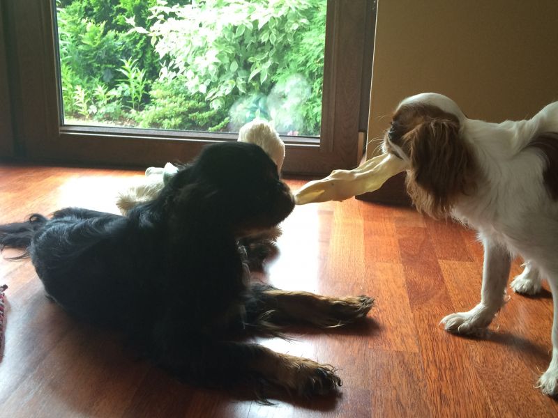 Jak bawię się psiakami maskotką, to Cyguś goni maskotkę, a Marviś Cygusia..i gryzie go w pupę, albo łapie za ogon