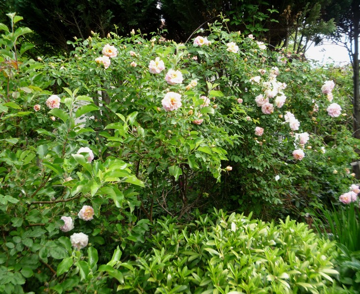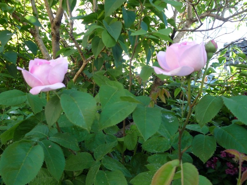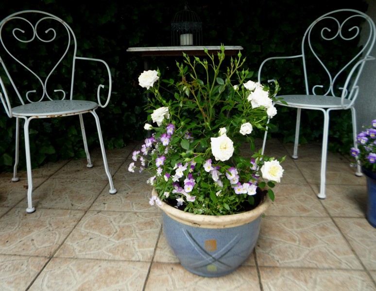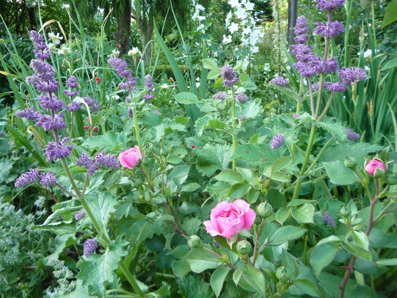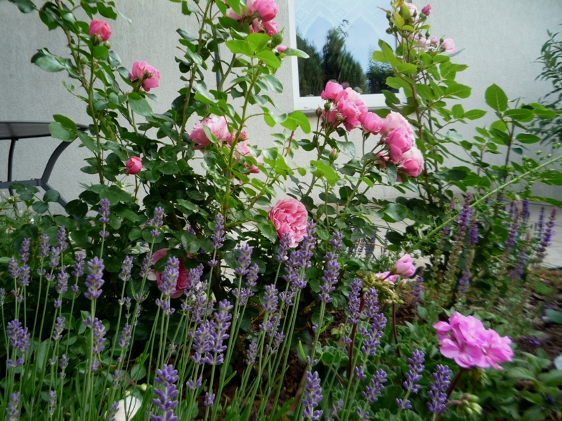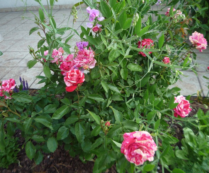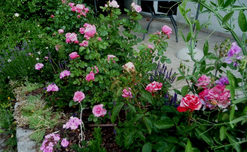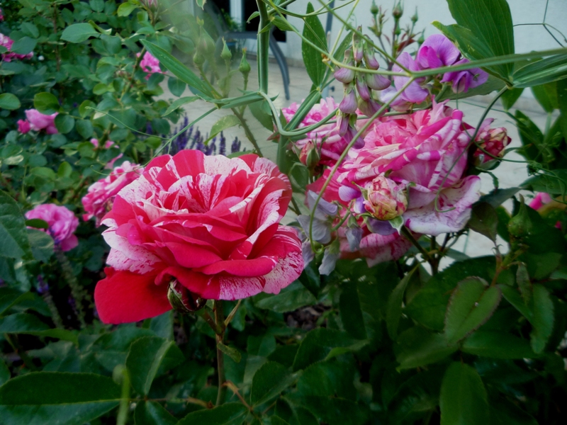 przy tarasie od południowej strony zaczynają pokaz róża Papageno owinięta groszkiem wieloletnim.